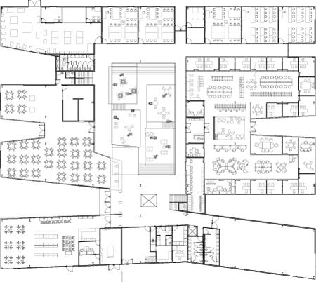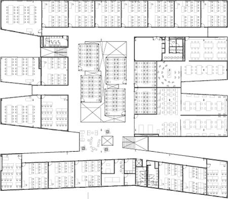 Laid out on a 12,000-square-meter lot along the river, the campus occupies the site in a compact block. The need for multifunctional areas and efficient circulations determined an almost square two-story block of 5,200 m², pierced with grooves to let in natural light and provide views of the surroundings. These incisions bring the landscape inside but also make the interior more complex, generating diverse spatial qualities and shorter circulations.