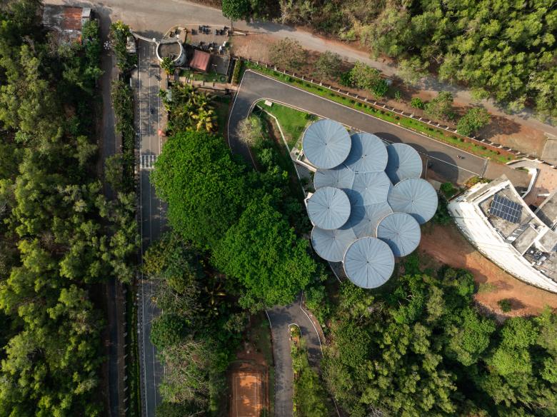 The Center for Inclusive Growth & Competitiveness is nestled inside the 40-acre residential campus of TAPMI located on a hillock, overlooking a picturesque valley with views of the forested green canopies. Occupying a humble land parcel of 5,000 square feet, it holds a significant position within the campus, offering a dynamic interplay between its immediate context and the broader environment.
