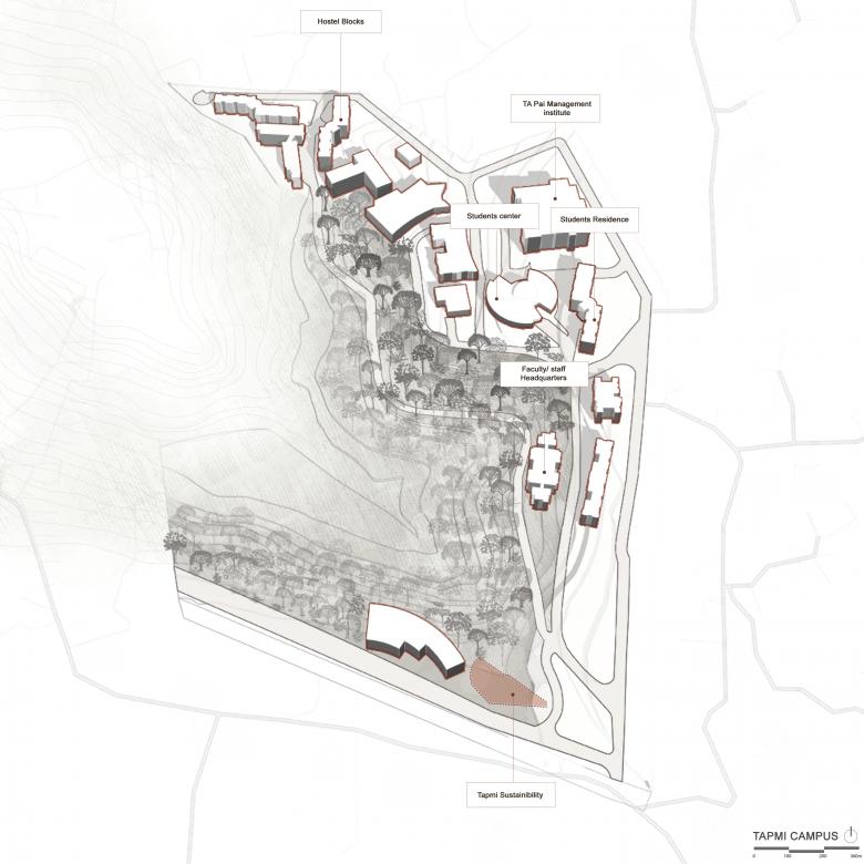 Manipal is a modern town along the coasts of Southern India. Its development began in early 1953, with a population of 2000-5000 people. Today, Manipal is home to an estimated 25,000-30,000 students, constituting roughly 50-60% of the city’s population. With the infrastructural blocks mushrooming, the urban fabric becomes rigid and devoid of social spaces for the young floating population. By re-imagining academic spaces, TAPMI Centre for Sustainability seeks to address this imbalance. Reinterpreting the conventional academic block, the intent was to design spaces that transcended academic hours, re-imagining them as community hubs.