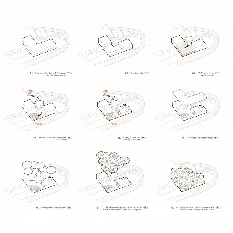 The building extends outwards, expanding its functionality into community spaces, for events and gatherings and often acting as a thoroughfare connecting the terrains at different levels. Thus evolving to meet the demands of modern learning while embracing the cultural roots and empowering the “now” to be future-ready.