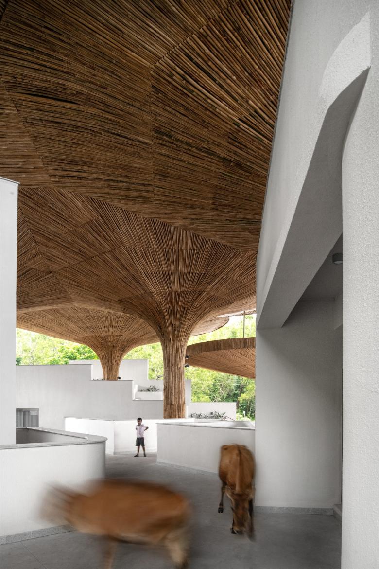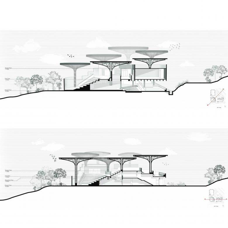 With the amphitheater serving as a porous connectivity hub, it was imperative to cover the terrace given the climate context. We drew inspiration from the chhatris made of bamboo, commonly found in the ghatscapes of Varanasi, India. These sunshades signify the starting point for various commercial, religious, and recreational activities. Providing shelter, chhatris stand not only as architectural elements but also as symbols of cultural continuity for local artisans.