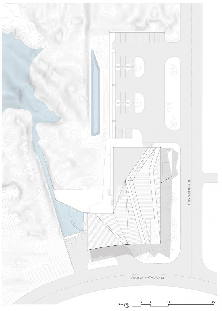 A saw-toothed roof draws from the geometry of old factories and the surrounding Monterrey Mountains.  The angled elements of the roof provide abundant natural daylight to the spaces below at the building’s northernmost elevations.  By modulating space and light through a fractured roof geometry, the building is able to maintain a rational plan to meet the rigorous requirements of the program, while providing a strong connection to the landscape both visually and metaphorically.