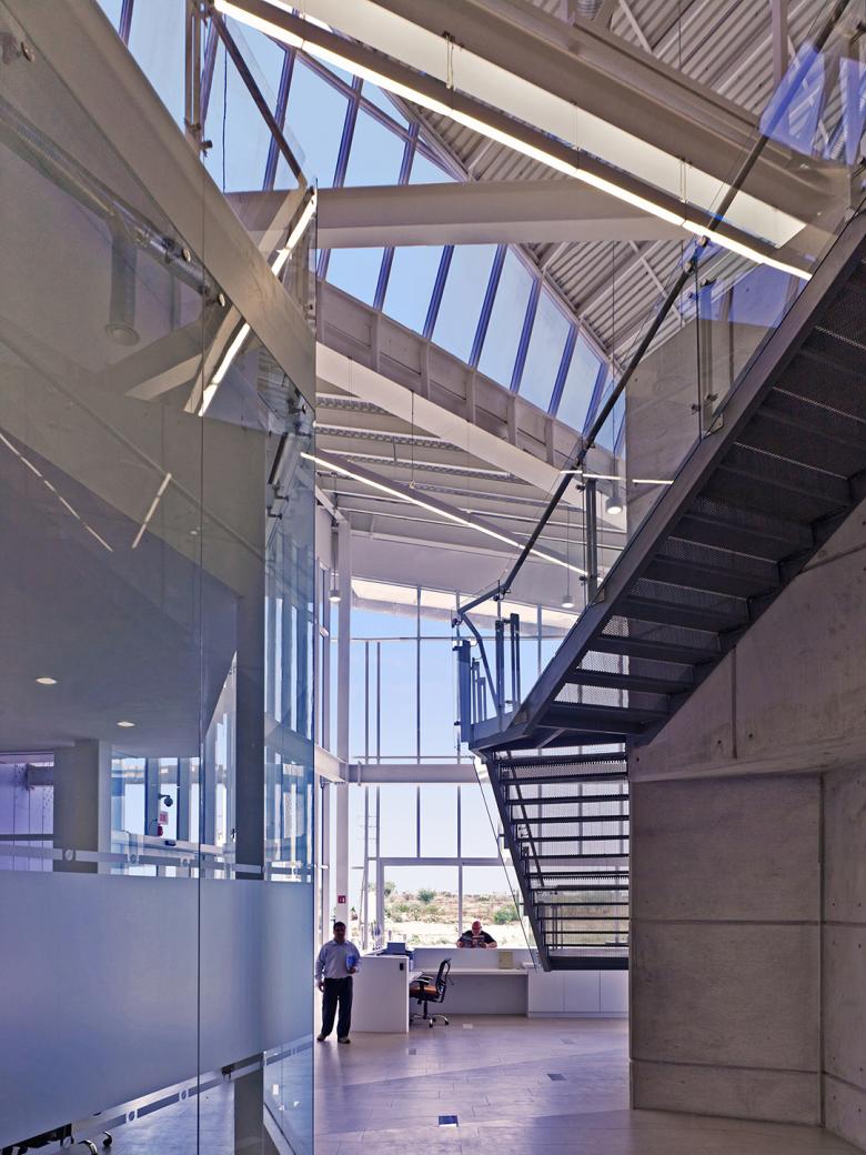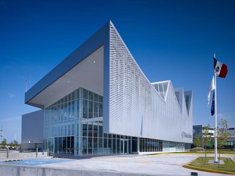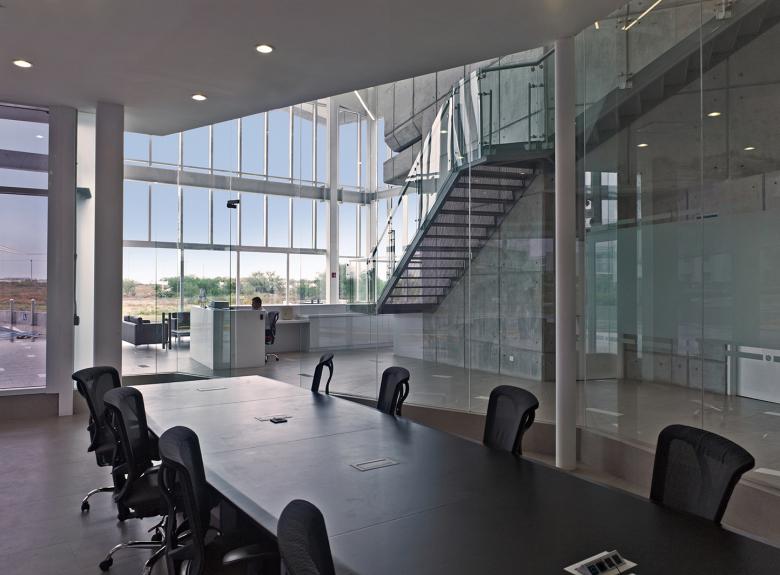 The Building was designed to passively adapt to the temperate climate of Monterrey, Mexico and utilizes strategies that leverage light and air to increase energy performance and improve workplace performance. Large exterior overhangs with metal screens function as light filters and shading devices.  Like many of the features at this project all design elements are multivalent and rich with meaning – performing several roles for functional, formal and experiential effect. 100% of the total regularly occupied building area is day lit.