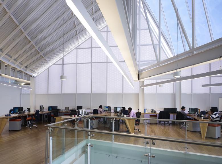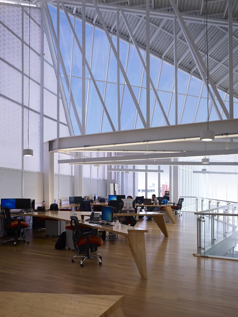 One of the team's primary objectives was to enhance the quality of the research environment for each employee by surpassing standards found in conventional projects. Daylighting all spaces was another primary strategy because it significantly impacts worker productivity, lighting and cooling energy.  All rooms have minimum 14-foot-high ceilings. Indoor air quality was emphasized by minimizing off-gassing. Formaldehyde-free FSC certified cabinetry, low-VOC paints, natural stone, and fluorescent lighting with low mercury content were used to minimize pollution from materials.