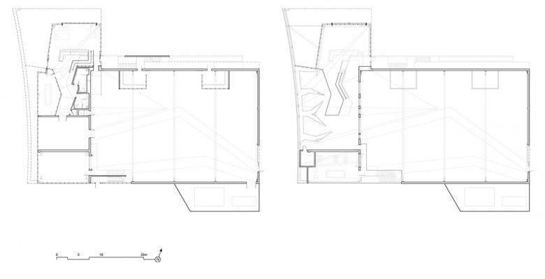 Programmatically, the building is divided into two volumes – warehouse/labs and offices functions. The upper story of the offices cantilever over the lower story to the west and is clad in a highly perforated metal skin and is the main entry facade. The lower story is mainly glazed and open to reveal portions of the research laboratory, machine room and other industrial functions not requiring visually security. From the exterior, the warehouse appears to float lightly over the mechanical and intellectual heart of the program, reversing the notion that an industrial building should be solid and protected. Rather, the building seems very open and is intended to feel vulnerable revealing parts of its inner program to public view.