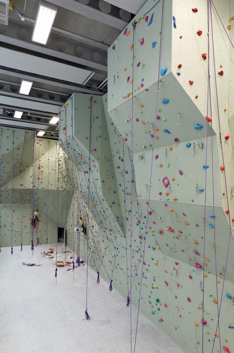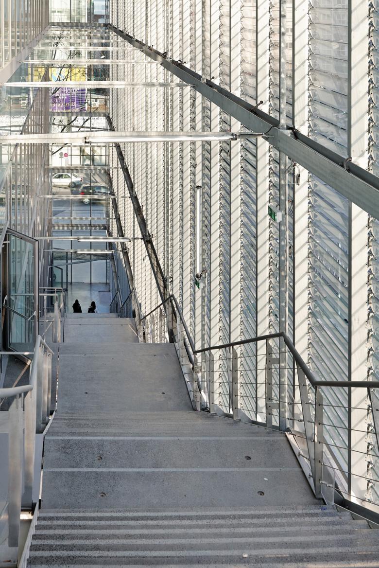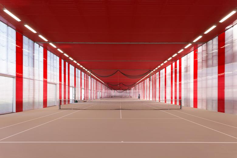 Im westlichen Teil des Baugrundstücks, längs der Ringautobahn, wird eine „bewohnte Schallschutzmauer“ errichtet, welche die neuen Anlagen auf dem Dach vor Verkehrslärm, Luftverschmutzung und starkem Wind schützen soll. Dieser Baukörper, auf dem sechs Tennisplätze vorgesehen sind, wird mit einer Reihe von Metallgerüsten gebaut und mit einer Doppelhaut aus Polykarbonat-Platten ausgekleidet. Horizontale Lärchenholzbretter sorgen für den Sonnenschutz der Ostfassade. Die drei anderen Fassaden haben einen in die Polykarbonat-Hülle integrierten Sonnenschutz in Form mobiler vertikaler Bretter, deren Stellung die Kontrolle von Sonneneinstrahlung und Belichtung ermöglicht. Autobahnseitig erinnert das Alternieren roter und durchscheinender farbloser Platten an die Lichter der Autos und ihre klaviaturartige Anordnung verweist mit einem Augenzwinkern auf die Cité de la Musique und die Philharmonie, die genau gegenüberliegen. (...)