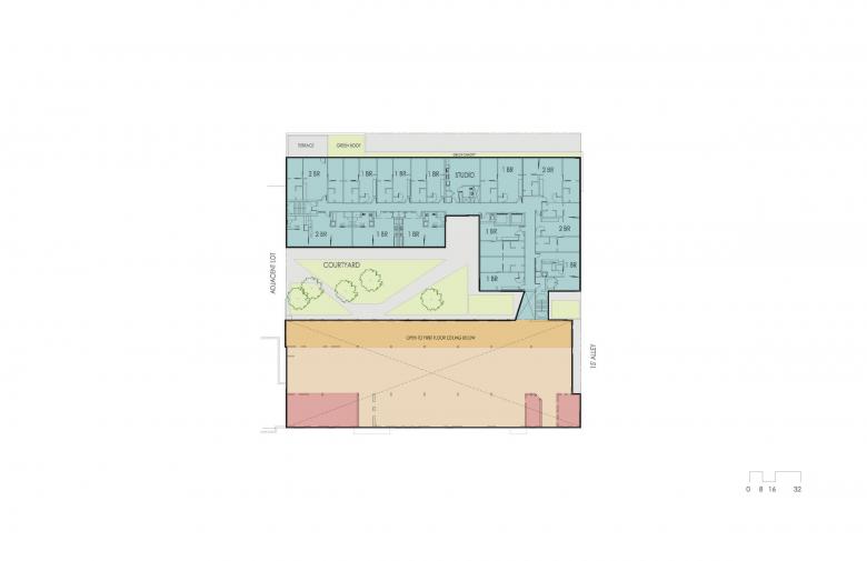 The design includes a five-story addition to the site that totals 114 affordable and market-rate living units. The development celebrates this historic resource by preserving the early 20th-century light industrial detailing of the building. The lobby is now located off the shaft that was used as an automobile elevator to lift Ford Model Ts and other vehicles to their service bays. Former automotive service spaces with terrazzo floors have become living units opening to a densely planted front garden. New housing units on the roof of the historic structure recall the form of "light monitors" that are present in the original garage to allow northern light to illuminate workspaces. Sightlines were carefully considered so that the new housing units on the roof are not visible from the street.