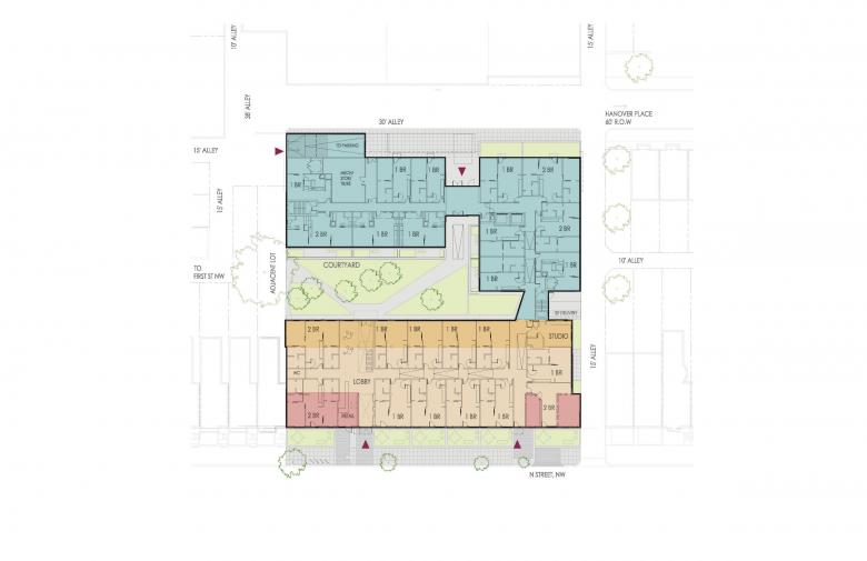 In addition to these specific historical elements, the design team identified several larger objectives that would allow the design to embrace and celebrate this unique historical resource. Those design objectives included restoring the N Street and alley facades by replacing all damaged, missing original windows; expressing the new main building entry at the location of the original; returning an open space to the center of the complex respecting the historic building’s volume; and integrating the addition to the historic building by setting it back from both the N Street and Alley (stable end) facades.