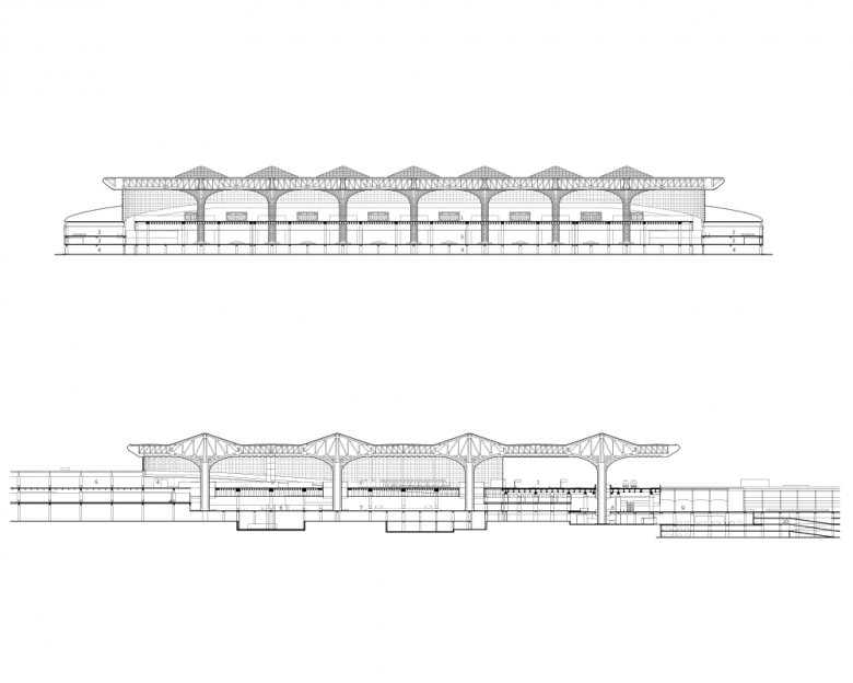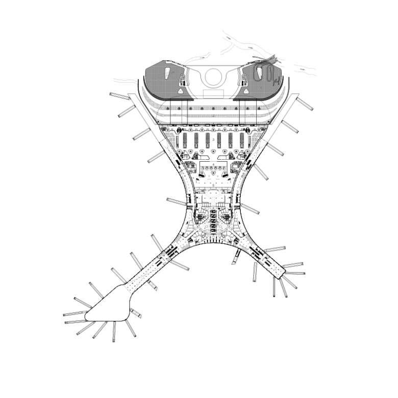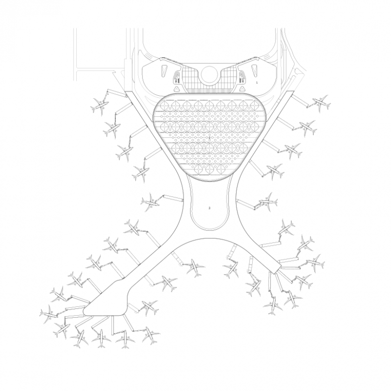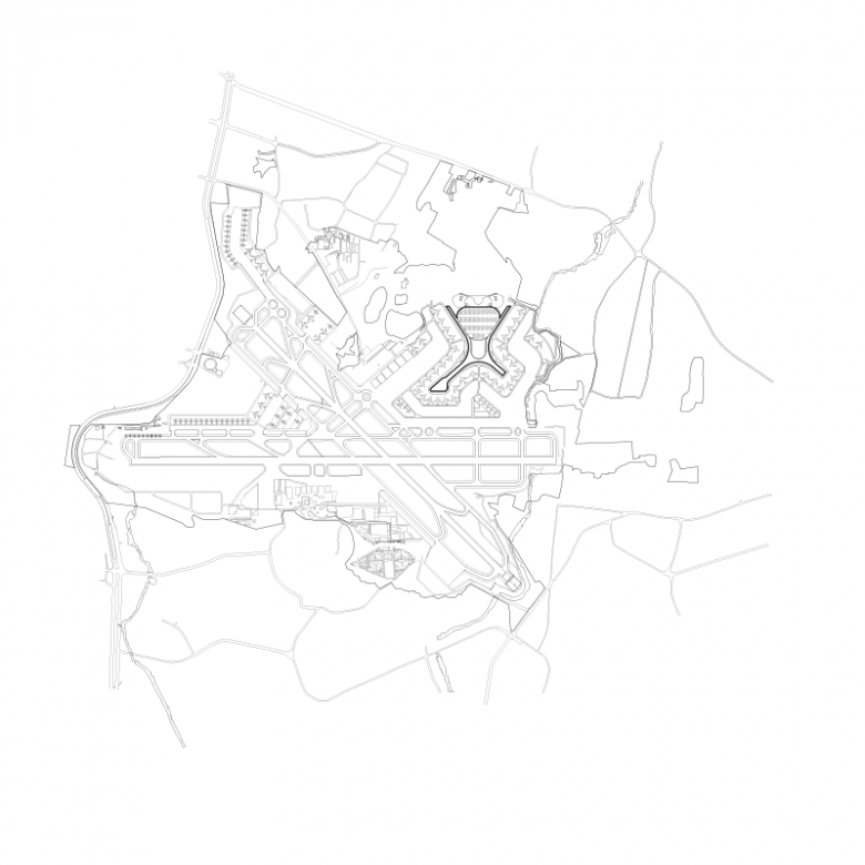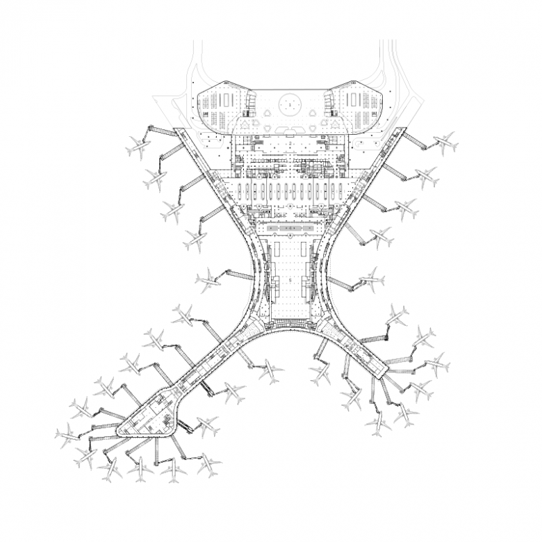 One of the largest challenges we faced on this project was the fact that the construction site of the new terminal building was located on top of the existing terminal, which had to remain fully operational during construction. This challenging site requirement inspired the elongated X-shaped plan of the terminal, which could both mold around existing structures and incorporate modular designs to accommodate rapid and phased construction.