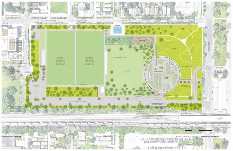 Not only is the location and standalone building new for the Park District. Ronan also chose materials and shapes that mark the beginning of a new era for the administration. While the former brownfield site that the building stands upon has turned green, the building opts for brownish-bronze colors. Convex metal screens give the facades depth and shade the building. The metal is combined with salvaged Chicago brick.