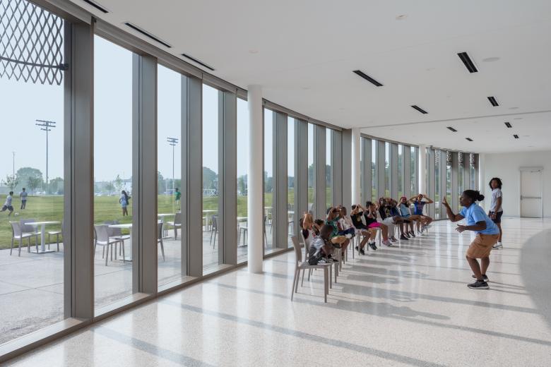 Cutting the two-story building in half is a zig-zag path that widens to form two courtyards in the middle of the floor plan. Without them, the 256-foot-diameter building would have been far too deep. The administrative areas combine smaller offices with larger groups of desks organized into long bars. The views towards the park enhance the work environment and also lets staff focus on the subject of their work. From the break room, employees can watch people in the gym through a glazed wall. Their terrace overlooks the park soccer fields, open lawns, playground, and a water feature, all designed by Site Design Group.