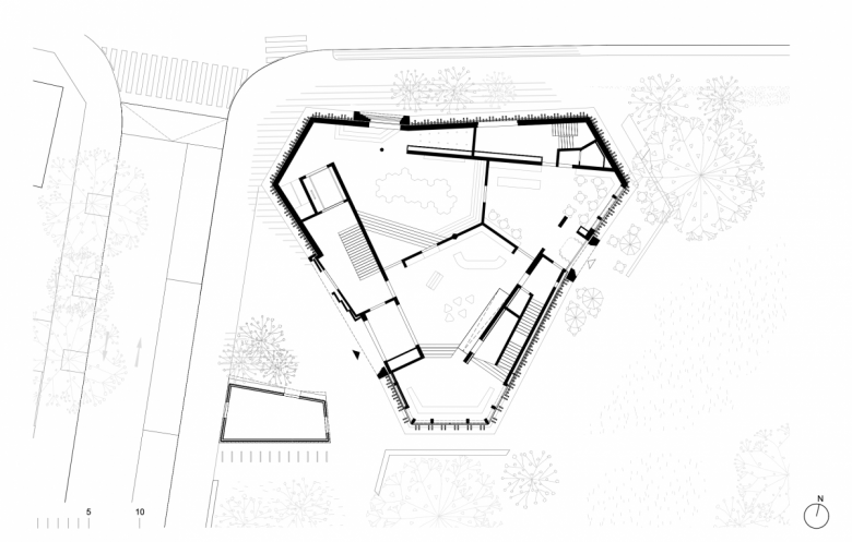 We conceived the project as a built landscape that develops out of the park: The helix staircase moves along the facade in the field of tension between interior and exterior space. The shadow of the mighty trees in the neighborhood is intended to overlay the shadow play of the precise wooden slats. The spatial boundaries are deliberately blurred. Along this alley-like staircase, one winds upwards and ends up in the treetops. The design idea is accompanied by the narrative of an artificial landscape and natural vegetation. At the center of the triangulated floor plan geometry, a polygonal, tree-like support takes on the loads. The supporting structure spans the exhibition spaces like an umbrella.