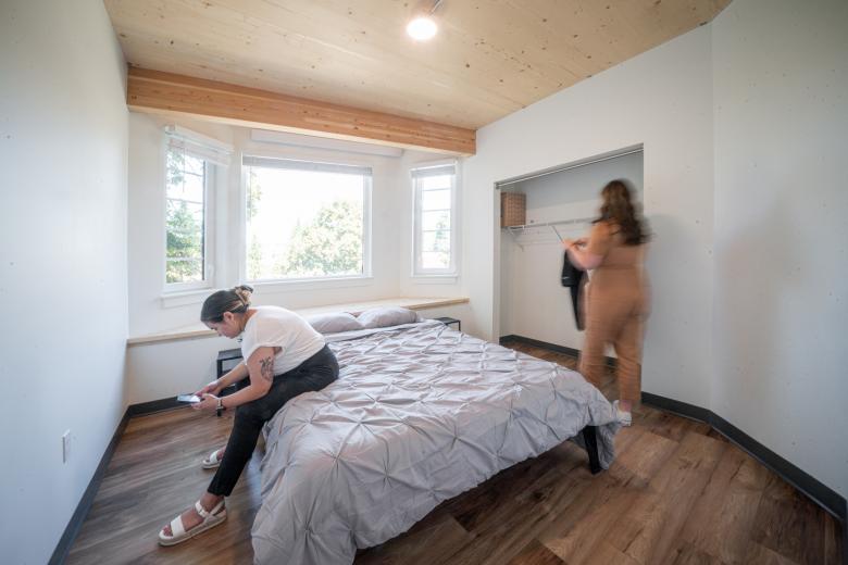 The courtyard serves as a metaphorical heart for the community with an oak tree at its center, and amphitheater seating to sit and socialize with neighbors or enjoy the view. Natural lighting in common areas, including the laundry, provides a consistent connection to the outdoors and surrounding trees, and also beautifully highlights the warmth of the exposed wood elements.