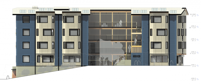 Initially, an interior double-loaded corridor design was considered; however, as the COVID-19 pandemic continued, it became clear that the corridors and stairs should be an exterior design to minimize indoor contact between residents. This became a design opportunity to celebrate the spans afforded by CLT. The open-air corridors needed minimal framing support due to the CLT panels, and the space was left open to encourage social engagement while allowing for privacy at the recessed unit entries. Shared porches at the ends of each corridor and along the courtyard provide views across the neighborhood, and give tenants a comfortable middle ground between the privacy of an apartment and the public street. Wood slat walls at the north end of the corridors create the option to combine units into suites, allowing flexibility for larger families.