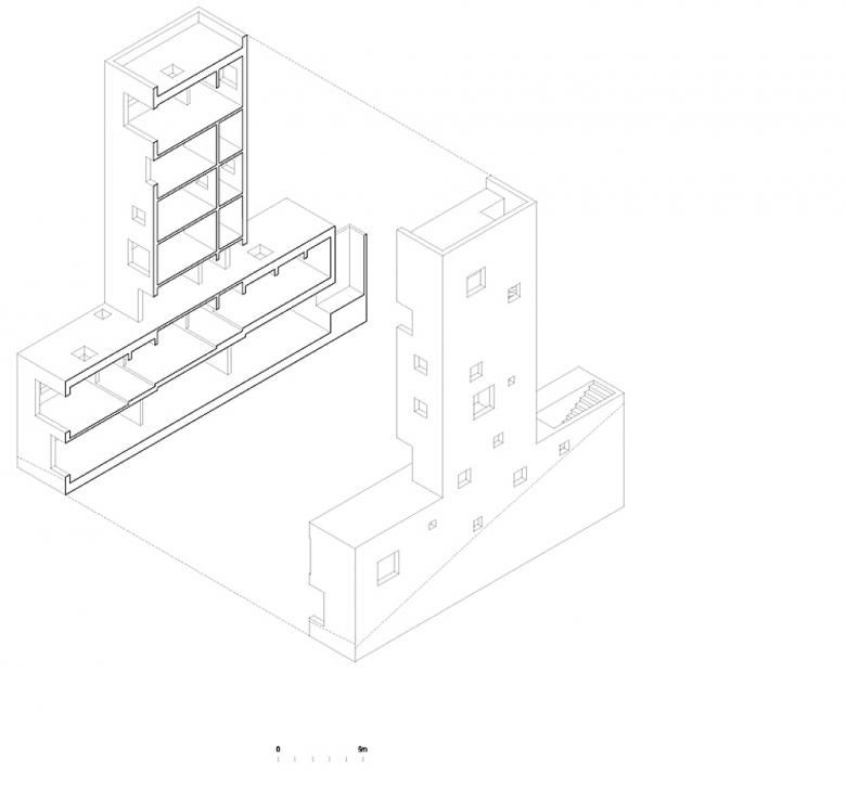 Trapped between these two factual worlds, domestic life is protected; a large room for day use and a couple of bedrooms piled on it for the night. The main room steps down towards the west. By setting the lintels at a single defined height, the progressive sequence of frames makes the perception of its depth relative.