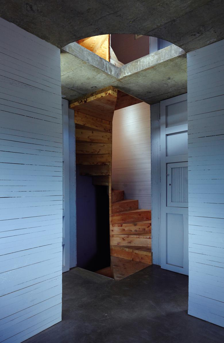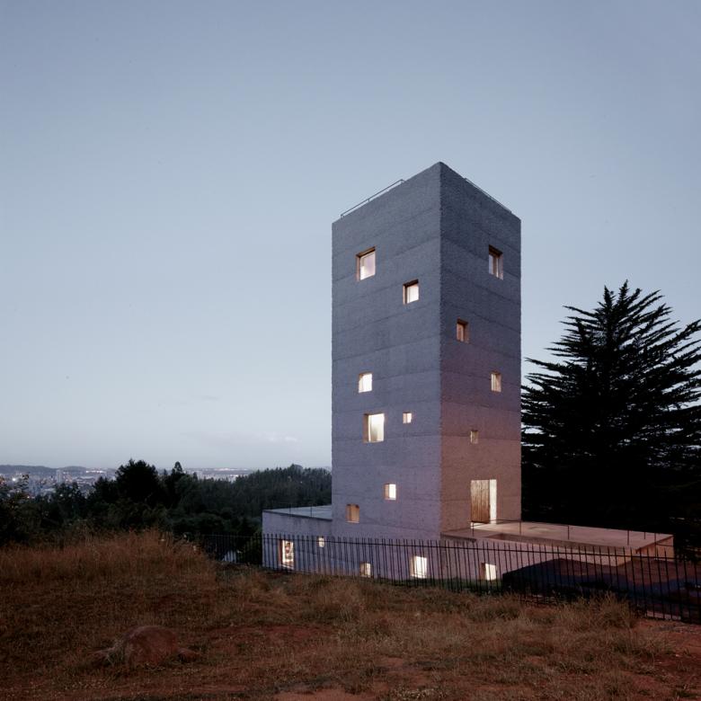 Entering the main room is equivalent to diving under the platform whose height is defined by the whole number 100 (the name of the house, Cien, means a hundred in Spanish). You reach the studio by facing a mirror that shows in the inside what lies across the street. Entering the tower is a kind of blindness. Here, the cypress cut and turned into steps locks into a continuous spiral that slowly offers the sight back while ascending.