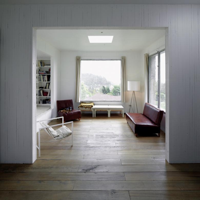 The construction is a regular and monolithic layering of concrete with exposed aggregate. Inside, the walls are covered in painted wood, almost without thickness and barely interrupted by the galvanized steel frames that hold the windows in place.