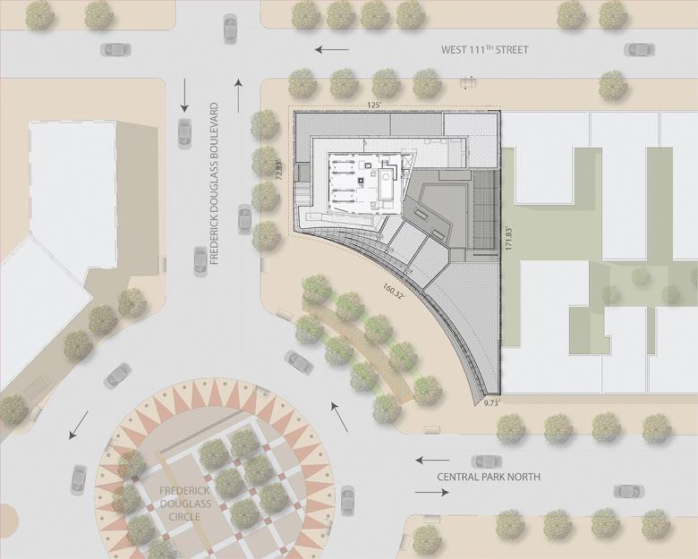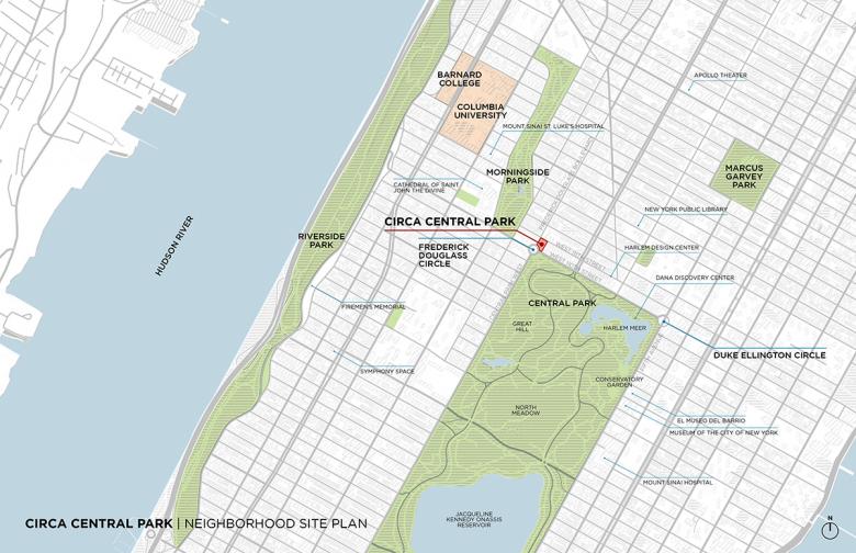 Circa Central Park is located on a prominent, highly visible, and unique site on Frederick Douglass Circle, a traffic circle at the northwest corner of Central Park and one of New York City’s few traffic circles. The design of Circa Central Park features signature curved geometry — hence its name “Circa” — which responds to the traffic circle in front of the building, the unique shape of its cornerstone site, and its unimpeded views to Central Park. The southwest façade’s tiered arced bands of glass and metal gradually set back and peel open, shifting in orientation from the roundabout to the park.
