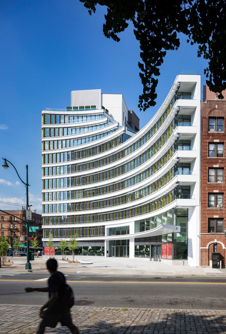 Circa’s design features two main façade expressions — punched windows in brick  and aluminum-glasscurtainwall — both for aesthetic and performance. The use of these two expressions has allowed Circa to respond to the different characters of its context. Its curved southwestern façade responds to Frederick Douglass Circle and features tiered arcs of banded glass between white metal spandrels. Dual-colored vertical aluminum fins optimize Central Park views, block out the western glare and heat, and enhance the vibrancy and character of the area. Brick façades along the north and west sides comprise dark and light gray blends of brick, which reference the Harlem context and late 1880s architectural styles of surrounding masonry structures. Sustainably sourced interior finish materials extend Central Park’s essential character of greenery, wood, and stone to the interiors, weaving it into the very fabric of the building. Natural, high-touch, and light materials are incorporated in the residences and common spaces.