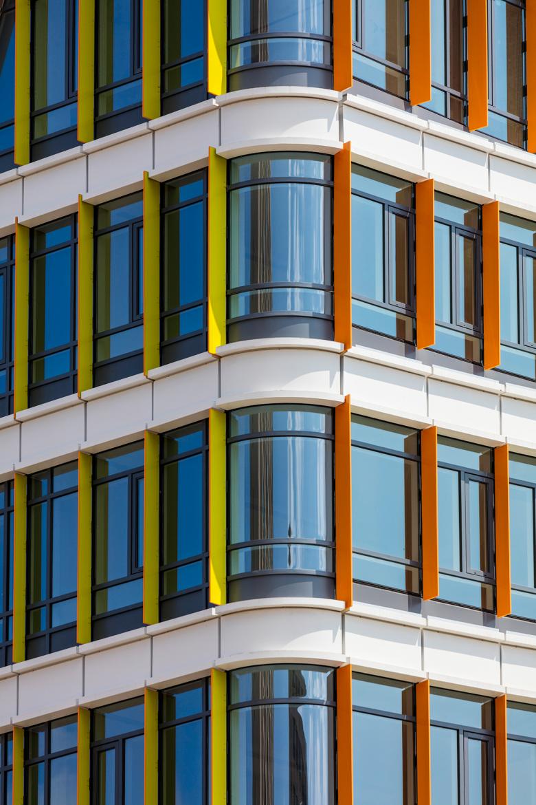 Circa’s façade of tiered, arced bands of glass and colored metal fins curves in response to the traffic circle in front of the building, and gradually sets back and peels open, shifting in orientation from the circle toward the park. The environmentally-responsive skin incorporates large expanses of glass for views and sun-filled interiors, while discrete shading elements temper unwanted glare and heat gain.
