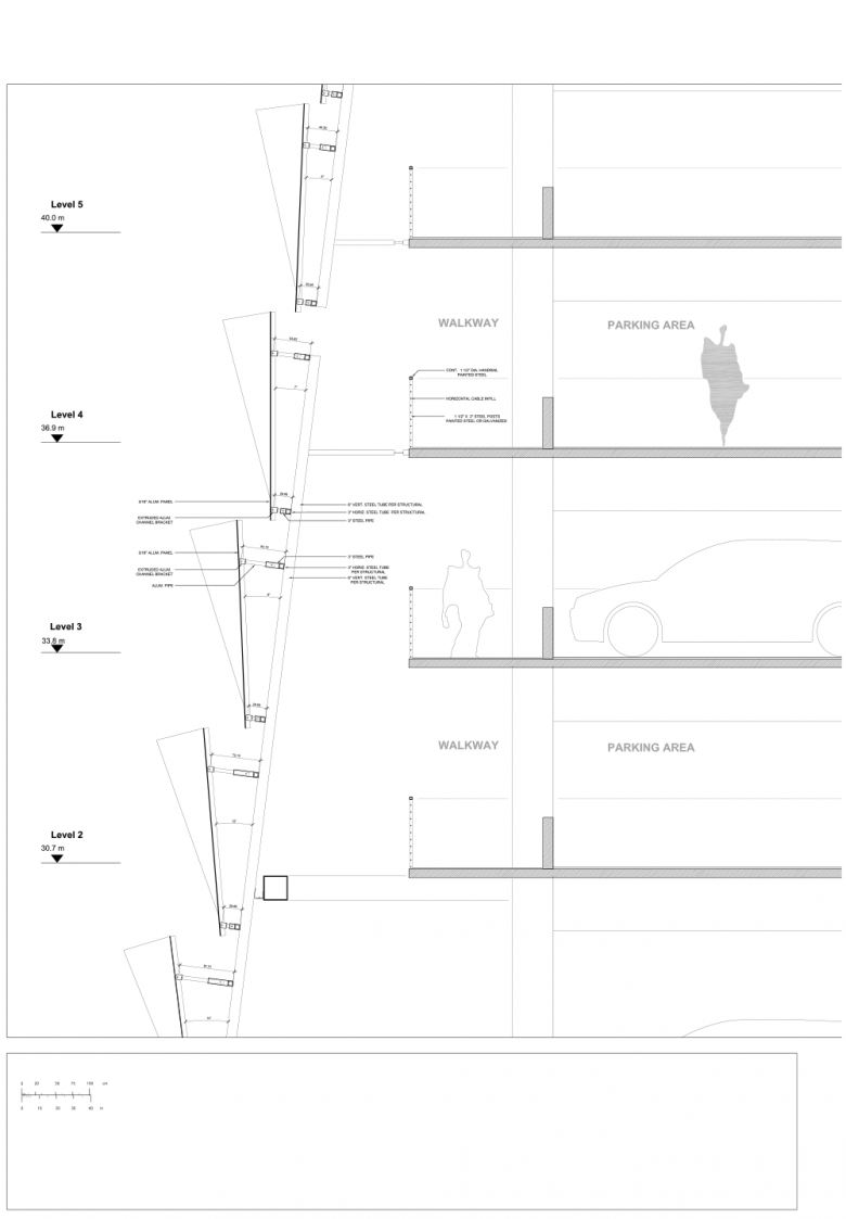 The Scope of the Parking Structure – even though being utilitarian – asked for inclusion of the public realm, ease of visitor access, visibility, state of the art façade treatment, and energy conserving measures.