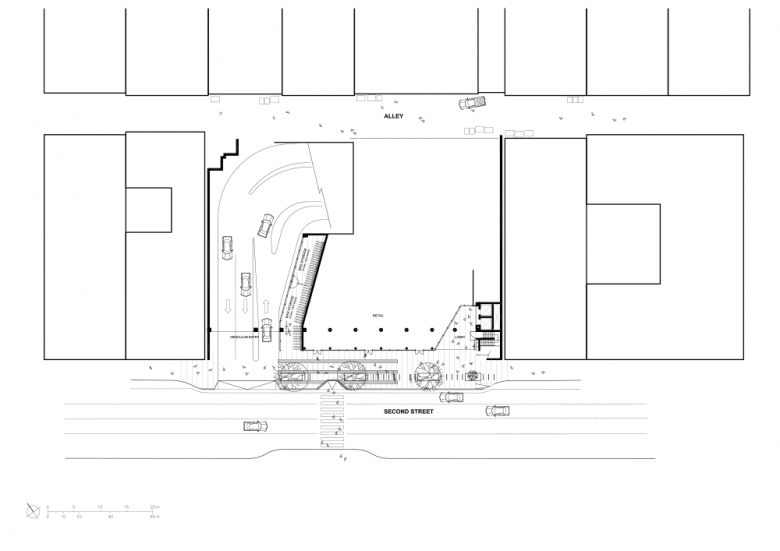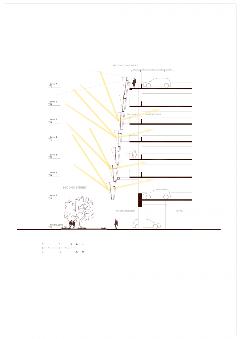 Public Parking Garage with 8 stories above, three stories below ground. Retail and Bicycle parking on ground floor.