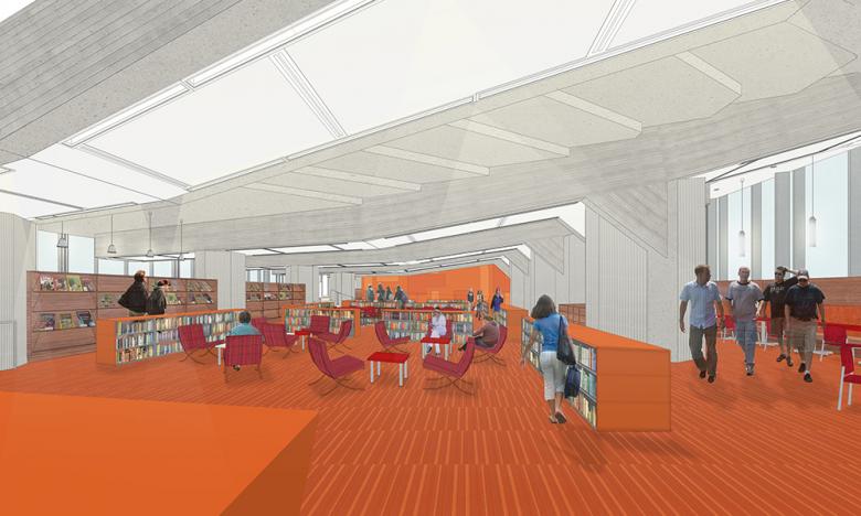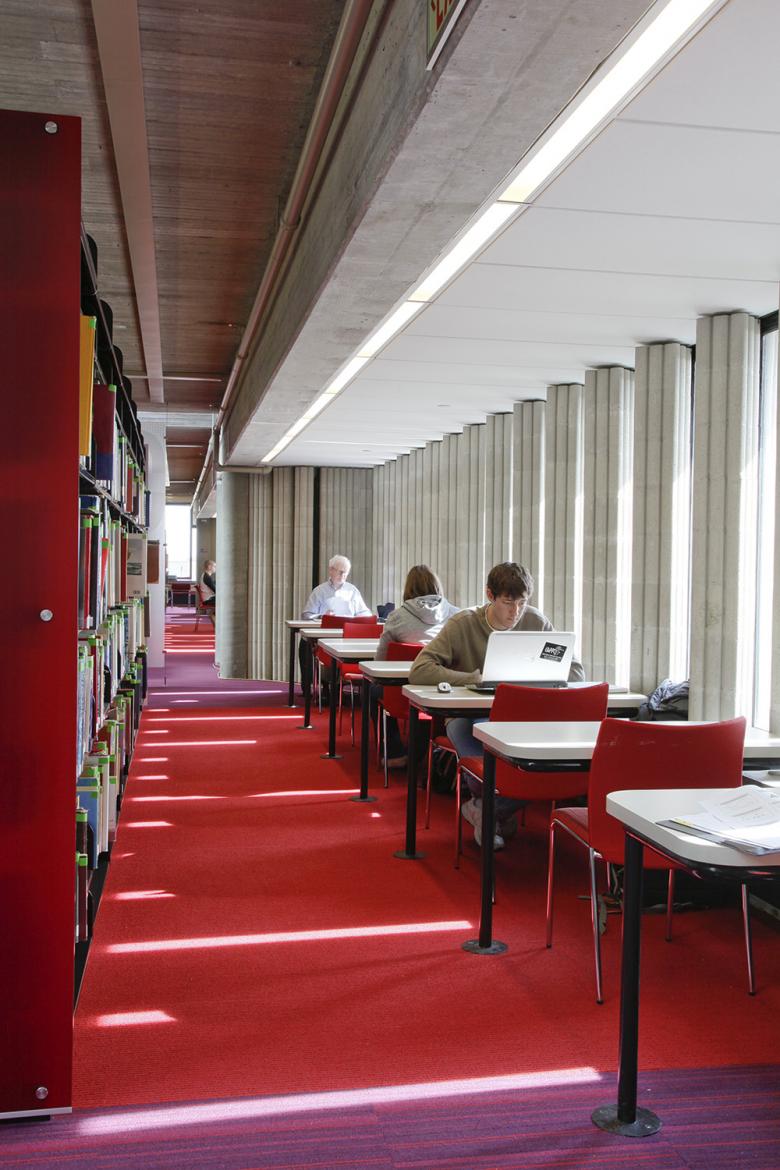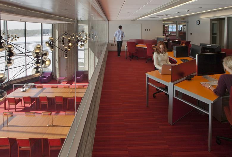 In the now fully accessible renovated library, updated reading rooms, teaching labs, service desks, and study areas are more efficiently laid out for easier navigation and ideal use.  Where the original study carols only allowed individual work, new program spaces and technology support collaborative learning.  The vivid color palette, coordinated furnishings, and new lighting brighten the once dim, sprawling library. Planners reoriented the salvaged bookshelves to allow daylight further into the deep floor plates. Clad with resin panels, they also carry cheerful color through the stacks.