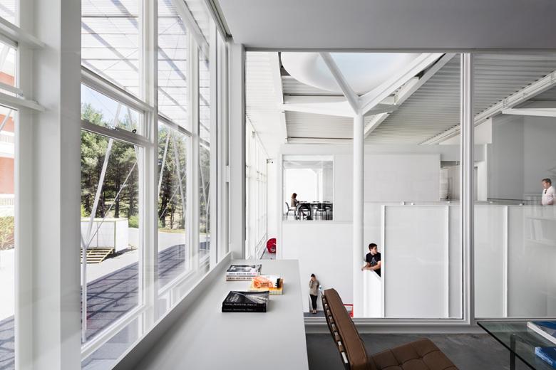 Proximity and transparency are supported with carefully detailed glazing between interior program elements. Transparency is also employed on the exterior facades to blur the line between the natural world and the interior environment.