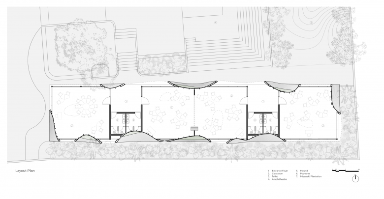 The design seamlessly merges spaces for playing and learning, blurring the lines between the two. The courtyard adds to this effect by adapting itself as a playground, a classroom, an amphitheater, or a puddle pool as the function demands. This unique spatial experience is further enhanced by the use of full-height glass panels in place of walls and skylights on the roof. By doing so, the design eliminates the understanding of what is inside and what is outside, thereby making the landscape an extension of the built space, and vice versa.