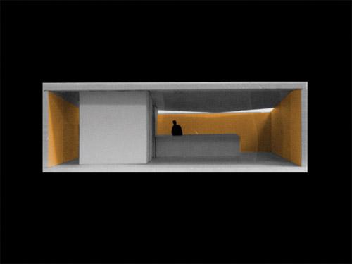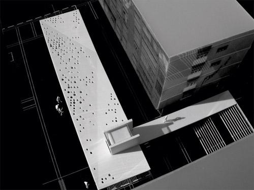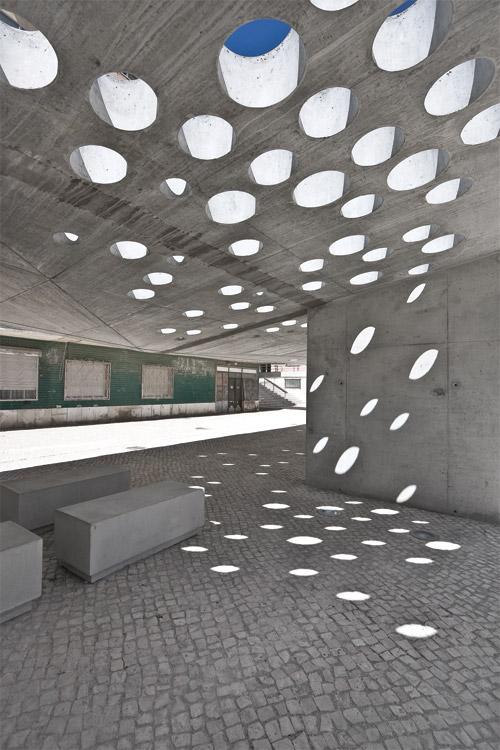 Firstly, the Shading Surface assumes a clear referential value in the existing square, assuming the rawness of the in situ concrete and exploring the lightness of its linear and slightly folded and heavily perforated horizontal shape. This affirmative floating plane not only gives protection from the elements and connects, with a lift, the different ground levels, but also acquires a subtle and surprising poetic dimension, reminiscent of the organic shades of the trees. In the words of the architects, "The three slope plans structured on five walls, are dematerialized by one regular process of pixelization. The holes produced a very iconic image to the square (important in one environment with lack of references) and play one interesting game of light under it." Secondly, the Coffee Shop, with the same structure of the unbuilt Tobacco Shop, is a small building that adapts itself to the topography, giving a new order to the interstitial space between the two long, parallel housing blocks. The building is almost buried in the ground with generous stairs in both lateral elevations, permitting the opening of the interior spaces to the public space in front. The roof of the Coffee Shop is again slightly folded with a linear zenithal light that illuminates the back wall intentionally covered with bright coloured tiles, "which changes a lot the interior ambiance according to the daylight and time of the year."