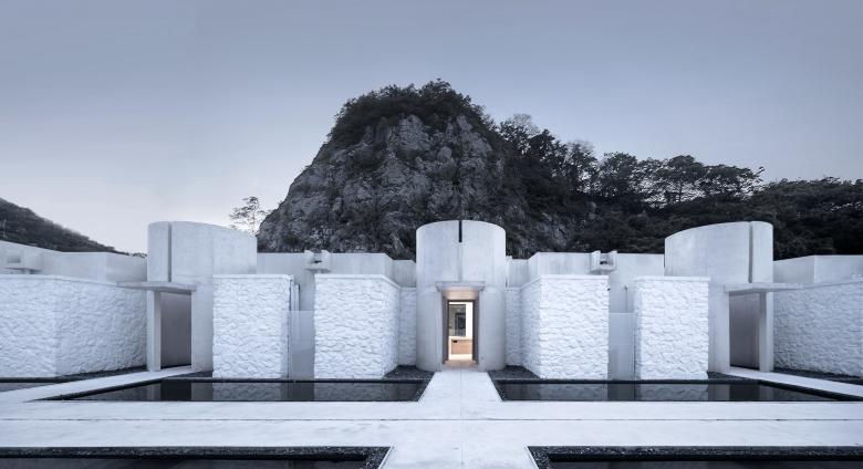Nowadays, all cement plants in the region are closed for environmental reasons. But their high-quality white cement made from limestone mineral is famous to this day. For this reason, as well as to integrate locally available resources, the stone from the foundation excavation was used to make the white cement render. The hotel has 39 units, including courtyard rooms, family villas and courtyard villa with mountain views, and offers five hot springs, an outdoor pool, restaurant rooms, conference and multifunctional rooms, a library, an exhibition hall, and a meditation room.