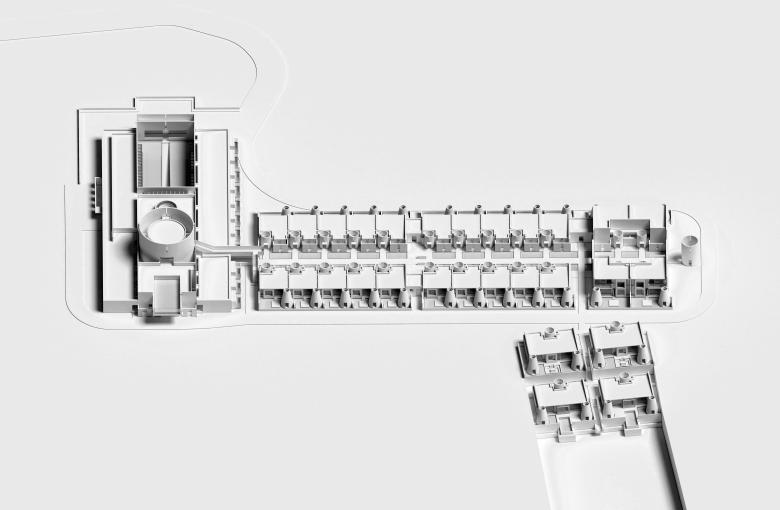 The quarry was cut along a ridge, creating the impression of an artificial valley today. The architects organized the hotel in three blocks each oriented along a different axis. The reception building is positioned along an east-west axis and includes a rotunda in the centre, from which the main block extends along a north-south axis before ending with four two-storey units as a spatial counterpoint to the entrance hall. At the point where this two-storey section begins, a second east-west connection to a third free-standing block containing a further four units that descend in the topography.