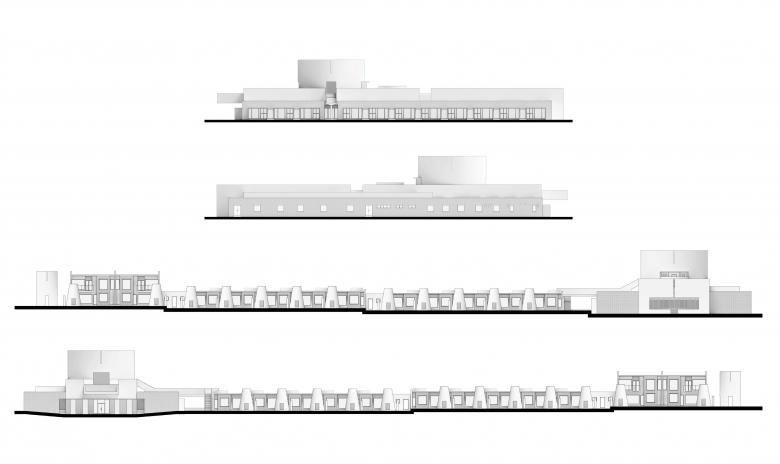 The buildings are made of exposed concrete and clad with white-painted stone cut from the former quarry. In the public outdoor areas there are water basins that reflect the surrounding environs. The cylindrical volume at the entrance and the conical shaped bathrooms of the single-story apartments set against the background of wild rubble and the rough landscape create an architectural dramaturgy that can be observed from the roof garden of the entrance building.