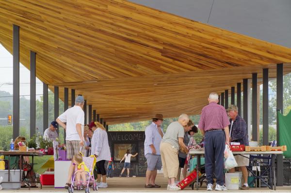 Because all goods sold at this market are required to be produced within a 100-mile radius, this distance became a goal for the procurement of construction materials. Essential to this approach was the use of recycled building materials in the construction, in particular the re-use of wood salvaged from an old barn in a neighboring town. Additional, new lumber, including locust decking and yellow pine cladding for the project were sourced from locally sawn timbers.