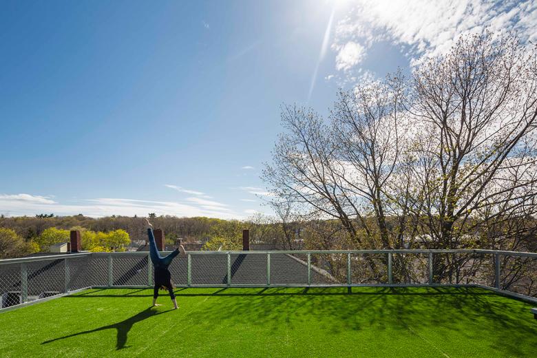 The one-story old construction used to be the ugly duckling of the neighborhood. The new architecture gives new meaning and life to the old by observing the context. It matches the height of the houses nearby and respects their privacy with strategically positioned openings. From the multipurpose space, the big window is able to capture the view of the sky and the high trees across the street, and it becomes a living painting that represents the passing of the seasons. On the roof garden the view becomes panoramic expanding across the sea of rooftops that create the landscape of this particular neighborhood in Brookline.