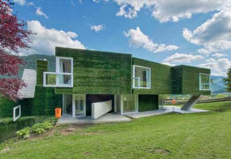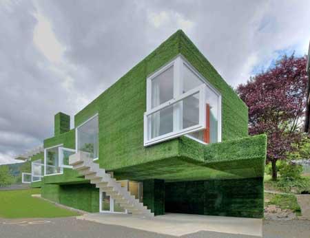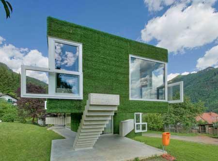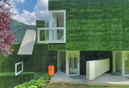 Außen ist dieser mit Kunstrasen überzogen, der die Kanten des Gefüges dämpft, ihm ein weich gezeichnetes Erscheinungsbild verleiht, das kontrapunktisch jene Elemente unterstreicht, die für die größten Irritationen sorgen: scharfkantige Fensterelemente aus weißem Kunststoff, die ihrem ursprünglichen Verwendungsort verlassen haben, aus dem Wandzusammenhang getreten sind, nun quer gelegt den eigentlichen Fenster vorgeblendet sind und hier als Brüstungen fungieren. Und Betontreppen, die den Baukörper wie zufällig abgestellte, noch nicht an ihren Platz gebrachte Versatzstücke begleiten, dabei jedoch auch nie ganz funktionslos oder rein poetisch sind, sondern als Sichtschutz dienen, die waghalsigsten Auskragungen abstützen, dem Rauchfangkehrer Aufstieghilfe und den Bewohnern jede Menge Abstellflächen für Klein- und Spielkram bieten.