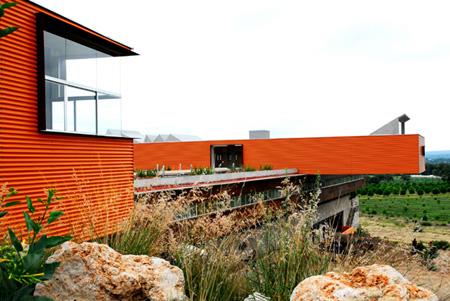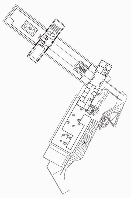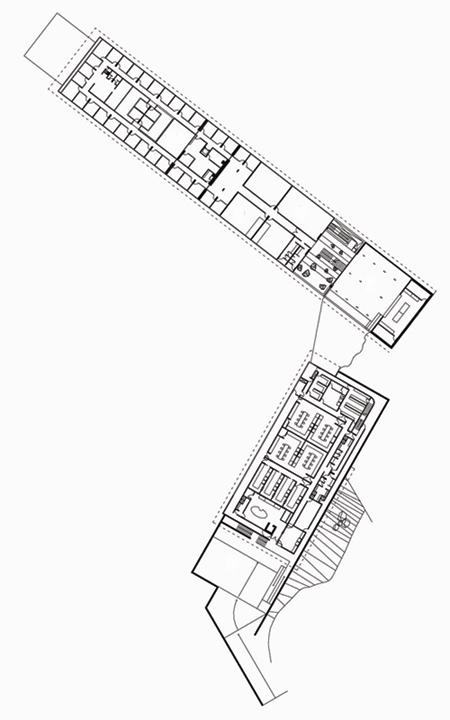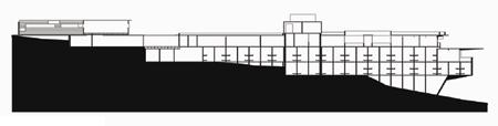 The building is located on a small rise, on the highest part of the lot. The structure rises from horizontal platforms adapted to the irregular terrain, rather like a ship run aground on the site.