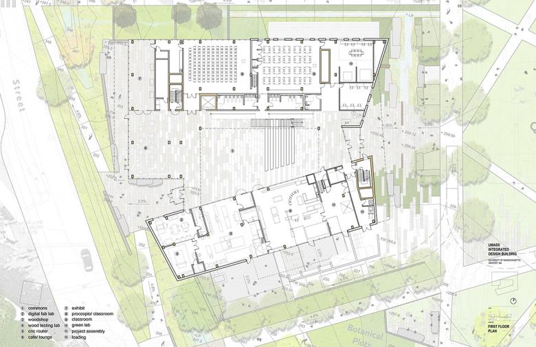To create a center space of collaboration, a coiling and rising band of studios, faculty offices and classrooms surrounds a sky-lit Commons for gathering and presentations. The building also forms a green roof terrace, a contemplative space shared by the studios and faculty and a potential experimental space for the landscape department. The slope of the site creates a tall four-story façade on the west facing the mall, and the rising structure invites the community into the building and reveals the activities within. The east side of the building faces a series of smaller historic buildings along Stockbridge Road, and its three story façade fits comfortably into this context. A durable envelope of copper-colored anodized aluminum panels and vertical windows suggest the color and patterns of forest and trees of the region. A highly innovative engineered timber structure makes this an example for the sustainable use of wood and builds on the leading edge research of the Building Construction Technology program. The project is targeting LEED Gold.