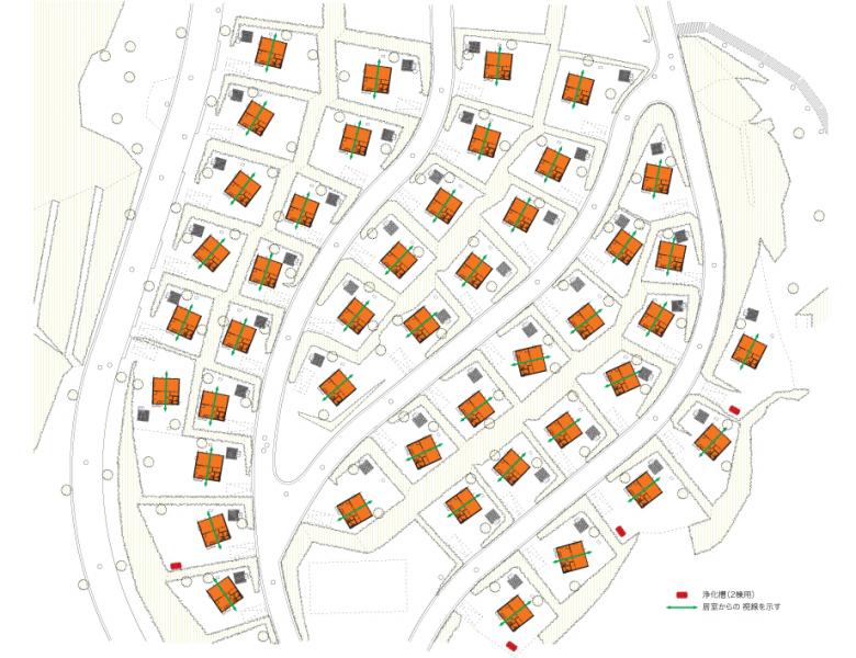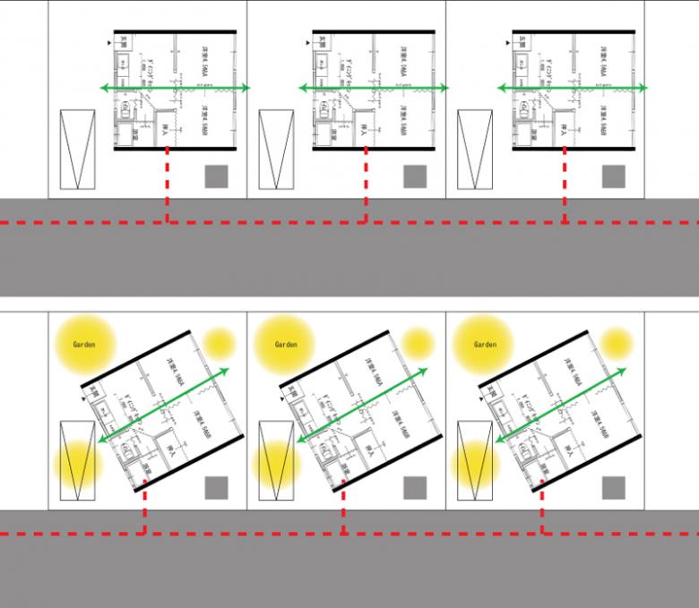 Sugawara: The shape of the individual housing units had already been decided when we got involved. But through their layout, we thought we might be able to mediate the relationship with the surrounding houses and environment, and create a village-like atmosphere. What we ended up doing was adjust the angle of each house so the residents’ lines of site wouldn’t cross, while at the same time creating a cohesive outdoor space. With this layout, the residents were able to interact with each other through the garden spaces while still maintaining their privacy. The plan is also extremely functional in terms of minimizing distances between elements of the infrastructure and allowing buffer spaces around the existing trees and infrastructure.