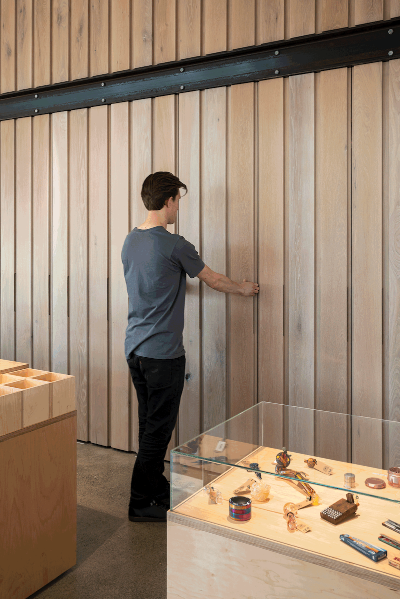 The experience, traffic flow, fixtures, loading, security, lighting, all aspects of the design, look and feel had to be invented as the design evolved. Products are stored in efficient pull-out cabinets that can be stocked directly from the back room. When fully closed, these tall, vertical cabinets resemble a wood-paneled wall and serve as a simple backdrop for the sales counter.