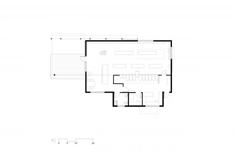A new wood trellis and deck define the entry and provide a venue for outdoor gatherings and events. The exterior — composed of dark metal siding and roofing with Cor-Ten metal accents — creates a visually quiet presence on a busy thoroughfare. Ample glazing at the entry and street façade produces an inviting level of transparency, reinforcing the image of cannabis as a mainstream product. Inside, the space is bright and airy, courtesy of light-stained maple and white oak, plywood cabinetry and display cases, and a skylight inserted into the existing roof.