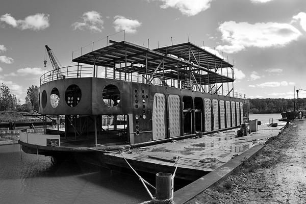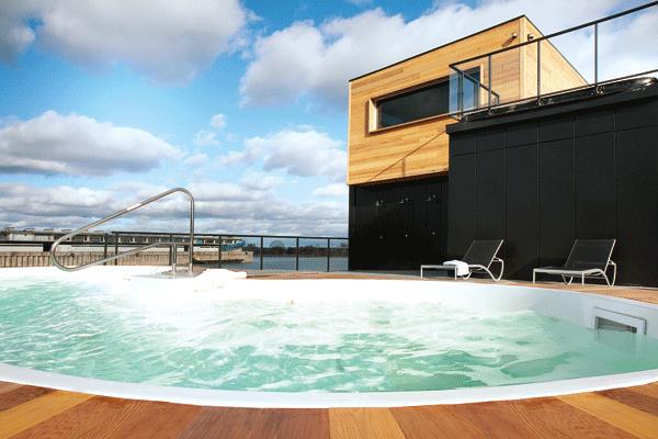 Viewed from the shore, the boat fits comfortably into the scenic post-industrial setting. It rises four levels above the waterline, and its black paint and horizontal wood cladding complement the adjacent landscape at the entrance to the Lachine Canal. When the spa glows at night, the design elements are more pronounced, in particular the 678 portholes punched into the walls on the first and second levels.