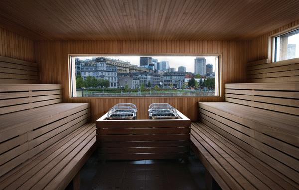 On a former ferry permanently moored at the foot of McGill Street, Bota Bota offers views of Habitat 67 across the river and the Old Port of Montreal, framed by the window in the sauna on the topmost deck.