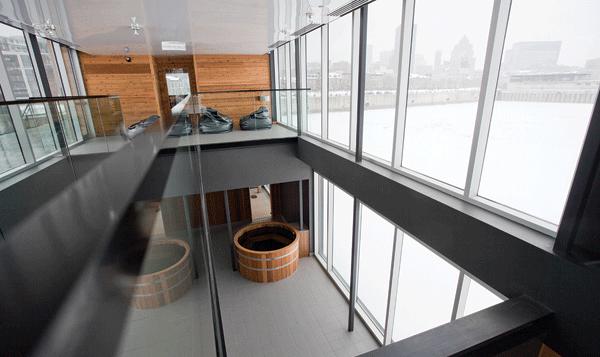For the interior, the architects opted for simplicity; their restrained concept brings attention to exceptional, amazing, dramatic views. Expanses of double-height glazing frame perspectives of the harbour and a bevy of Montreal icons, including the art deco Aldred Building, Buckminster Fuller’s geodesic dome for Expo 67, the majestic Grain Elevator No. 5, and Moshe Safdie’s signature Habitat 67 housing project. The lounge on the second level is particularly striking: the large round windows are big enough for spa-goers to curl up inside in their bathrobes and survey the river, almost as if floating downstream. And two custom-designed exterior whirlpools offer visitors a chance to take in the city panorama under the stars – a sybaritic experience, especially during a light snowfall.