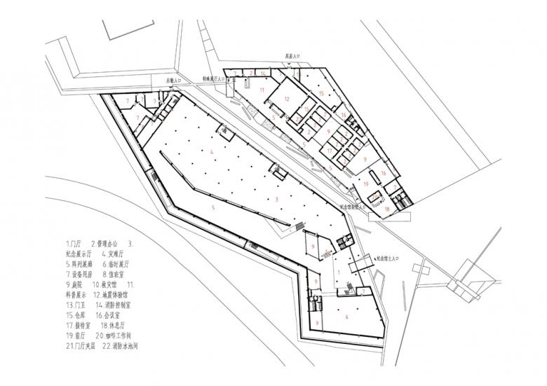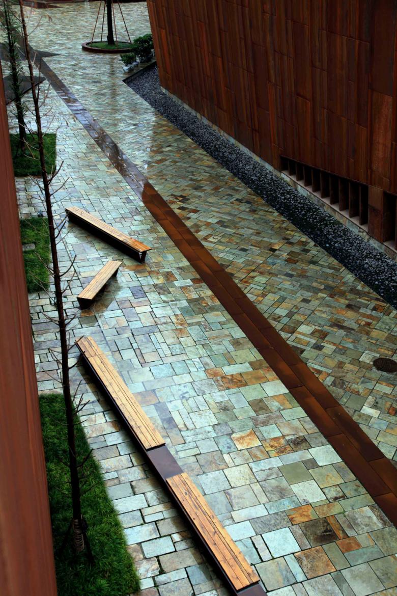 Cai’s proposal represents the earthquake as a huge green grass surface in which cracks are symbolically integrated as paths for the circulation of the visitors. From the entrance side the landscape rises smoothly and the pedestrian routes become sunken ways between warm brown walls of Corten steel, which cover the facilities behind. The visitors are led to the entrance of the museum, to service facilities and to the memorial courtyard. The network of paths across the area allows access without hierarchy and the main entrance court is indicated only by a small clock tower. The paths are paved with slate slabs and provide benches for rest, whereas the actual entrances to the buildings are rather unspectacularly integrated into the covering of the weathered steel of the façade.