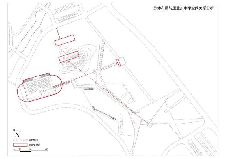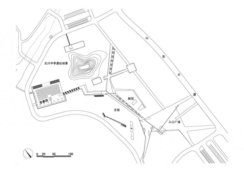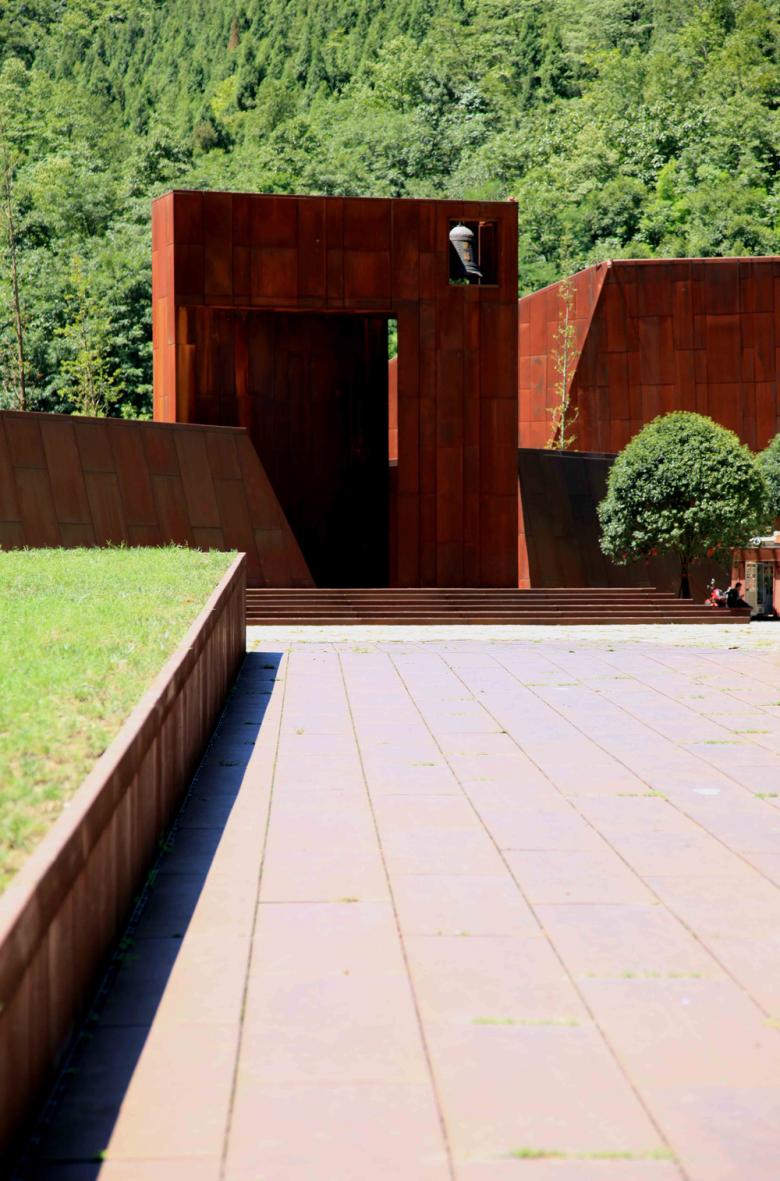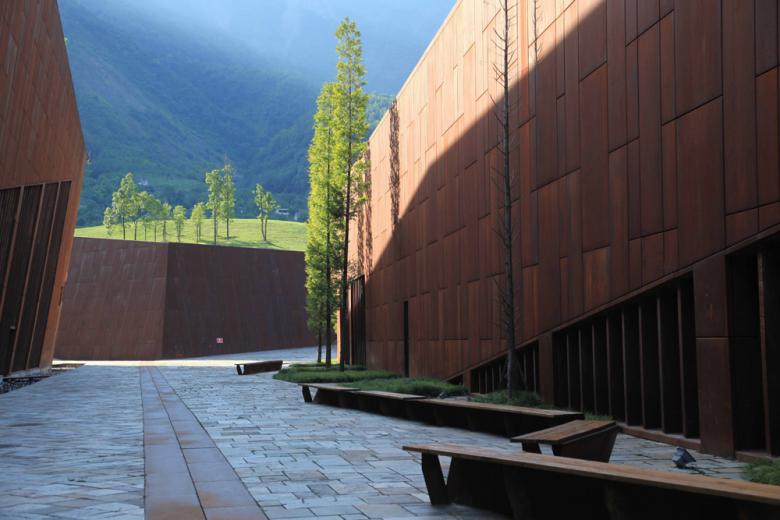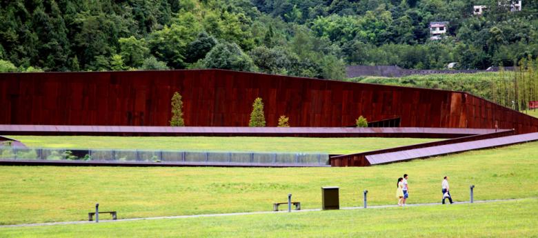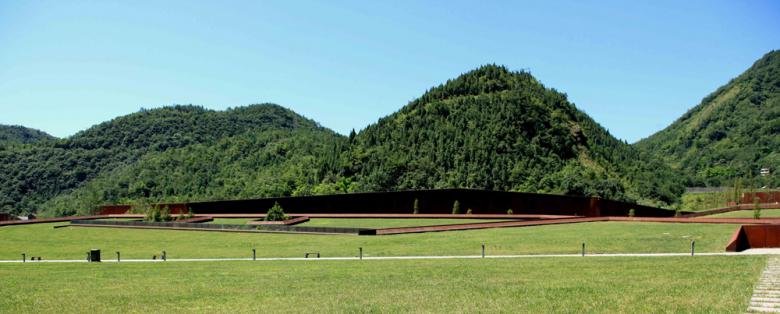 The new memorial landscape spans across the whole valley on a sloping level and is bordered on one side by a small road and on the other by a four-lane highway. Beyond the roads the landscape rises steeply and is covered with forest. Within the valley the road leads to the remains of old Beichuan Town; the ruins were kept as a memory for the people. As a place for official ceremonies and private mourning, the new National Earthquake Memorial covers almost fifteen hectares. It includes a museum and service spaces as well as open air facilities embedded in the park-like landscape.