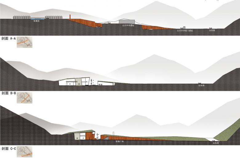 One of the most severely hit areas was Beichuan County, where over eighty per cent of the buildings collapsed and more than 15,000 people were killed. Among the buildings that collapsed was the Beichuan Middle School in which more than 1000 pupils and teachers died. The government decided to build the National Earthquake Memorial on exactly that spot. The architecture faculty of Tongji-University in Shanghai was given the commission to organize a competition among their faculty members. After several rounds of negotiations the first prize was awarded to Cai Yongjie, who proposed a memorial landscape with integrated museum. The integration of the buildings into the landscape was what finally persuaded the jury. To build a memorial without a dominant building and a huge square in front of it, is quite unusual in China and reflects the shock of all the decision makers.