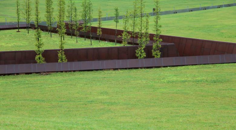 Besides the smooth green grass, the rusty tone of the slate paths and the brown of the rusty steel, the landscape is defined by the planting of dawn redwood (Metasequoia), which will grow to a height of sixty meters. The spatial concept in combination with the surface materials and the planting resulted in an unusual memorial for the local residents as well as visitors from afar. It keeps memories alive and offers space for reflection of real human feelings and questions. Such a memorial is meaningful and gives back dignity to those who survived, even if their request for visible elements of the human failures that led to the disaster are only covertly inscribed in the overall layout of the landscape.