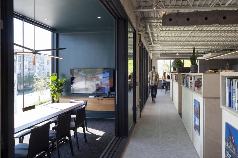 As an adaptive reuse project, this design prioritizes utilizing the existing structure within a changing neighborhood to preserve energy and character. A multitude of cuts made in the existing tilt-up structure introduce extensive daylight where once there was none, while rooftop PVs provide the rest of the electricity; some of these openings provide access to new outdoor shared space for collaboration, socialization, and views. The goal of energy efficiency and sustainability was met, with electricity being provided 100% with renewables.
