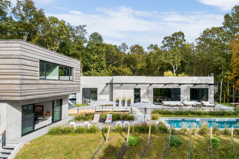 The Pool House has two spacious bedrooms and two baths on the top floor, and a living room/kitchenette, full bath and sauna on the intermediate pool level adjacent to large wood deck. The 750-sf, two-car garage is on the lower level with a connecting interior and exterior stair. The Pool House is equipped with two electric car chargers, one in the garage and one at the upper level parking area. Back up batteries for emergency power store electric from solar panels in case of a power outage. The house is built out of concrete, the facades articulated by design to create a pattern. Mostly, concrete was used for speed of construction, durability, and ease of upkeep. The upper portion of the Pool House is clad with Cedar boards, designed in variable horizontal siding widths and depths. They are a salute to the local building vernacular used on Shelter Island.